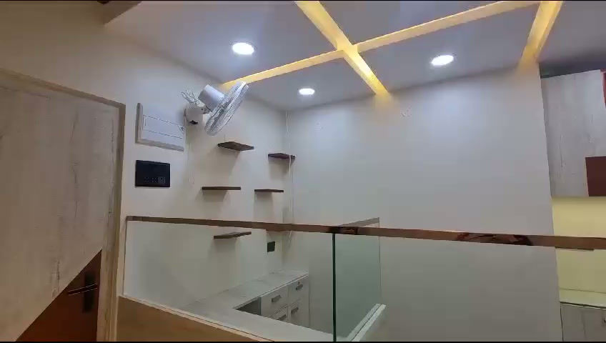 A thoughtfully designed compact office where every inch is optimized for function and flow. This project features a well-defined main chamber, a front-office workstation, and a discreet pantry counter tucked behind a partition. The space blends warm wood tones with clean white surfaces, achieving an aesthetic yet highly efficient working environment tailored for daily productivity.